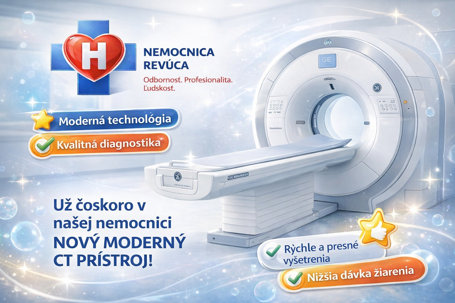 S radosťou vám oznamujeme, že sme z vlastných finančných prostriedkov zakúpili nový moderný CT prístroj GE Revolution Maxima! 🏥✨